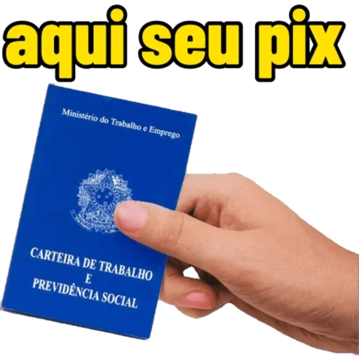 Uma mão segurando uma carteira de trabalho azul com o texto 'aqui seu pix' em amarelo acima. A carteira tem um brasão e o texto 'CARTEIRA DE TRABALHO E PREVIDÊNCIA SOCIAL'.