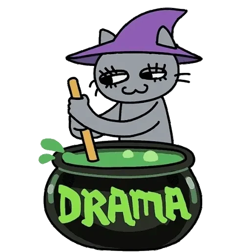Gato cinza com chapéu de bruxa roxo mexendo uma poção verde em uma panela preta com a palavra 'DRAMA' escrita em verde.