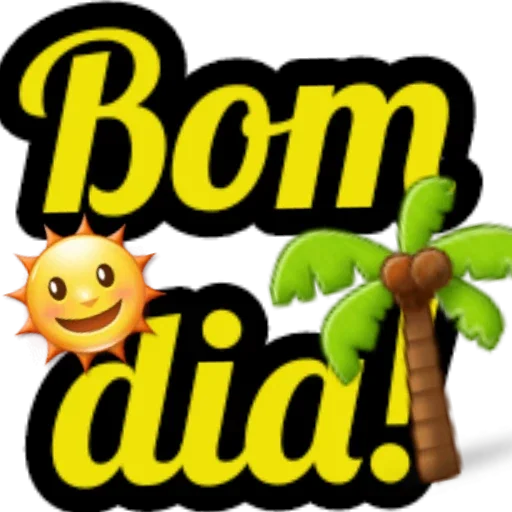 Um sol sorridente ao lado de uma palmeira, com o texto 'Bom dia!' em letras grandes e amarelas.