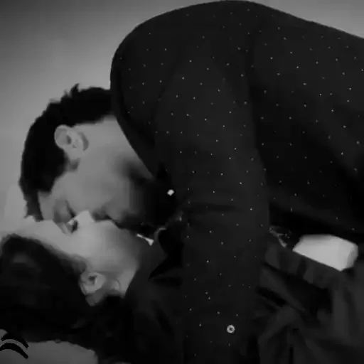 Um homem beijando uma pessoa, ambos com expressão de intimidade. A imagem é preto e branco.