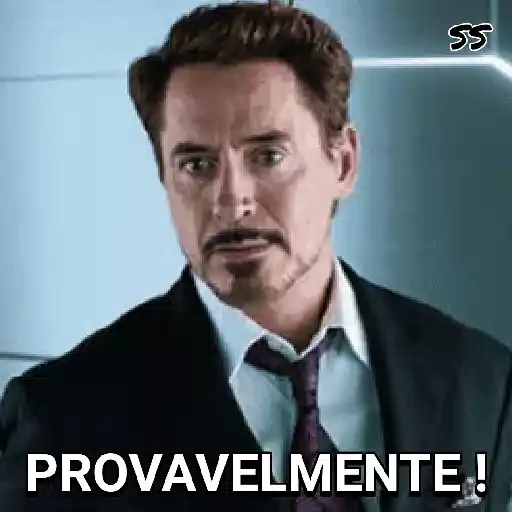 Robert Downey Jr. como Tony Stark, de Homem de Ferro, com expressão séria e texto "PROVAVELMENTE!" na parte inferior.