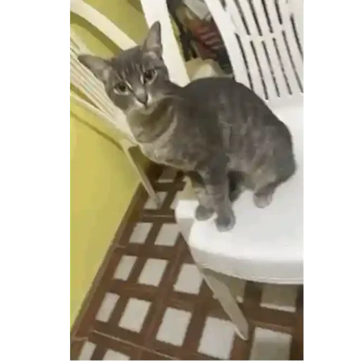 Gato cinza com olhos claros sentado em uma cadeira branca, com um piso xadrez marrom e branco ao fundo.