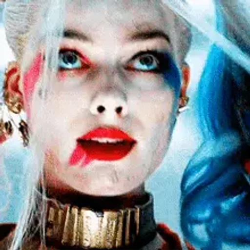 Rosto de Harley Quinn com cabelo metade rosa e metade azul, maquiagem branca e vermelha, e um olhar sedutor. Ela está…