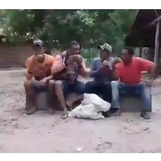Cinco homens sentados em um muro ao ar livre, em um ambiente rural ou de periferia, com árvores ao fundo. Eles estão vestidos com roupas casuais.