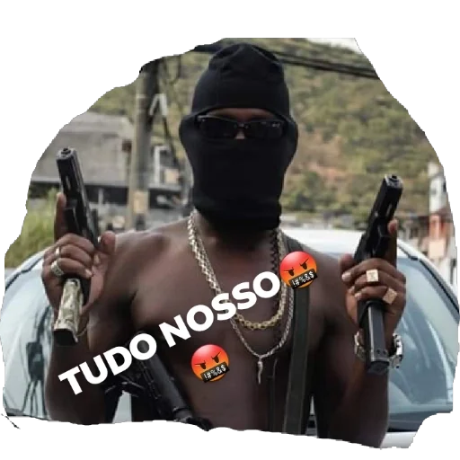 Homem com máscara preta e óculos de sol, segurando duas armas, com texto 'TUDO NOSSO' e dois emojis de careta de dor.
