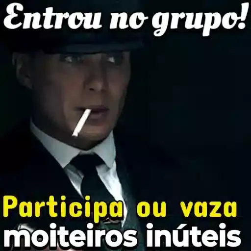 Um homem de terno e chapéu, com um cigarro na boca, em um fundo escuro. A legenda 'Entrou no grupo!' está escrita em branco na parte superior e 'Participa ou vaza moiteiros inúteis' em amarelo e branco na parte inferior.