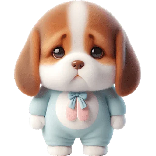Um cachorro de pelúcia com corpo de bebê, usando um macacão azul claro com pés rosa. Ele tem olhos castanhos grandes e orelhas compridas.