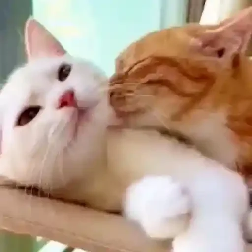Dois gatos, um branco e um laranja, se acariciando. O gato branco olha para a câmera com expressão surpresa ou confusa.