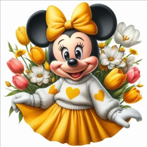 Mickey Mouse vestida de amarelo e branco com flores coloridas ao fundo. Ela usa um laço amarelo no cabelo e tem um sorriso no rosto.