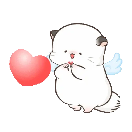 Um hamster branco com asas azuis e um coração vermelho na frente, com expressão fofa e língua para fora.