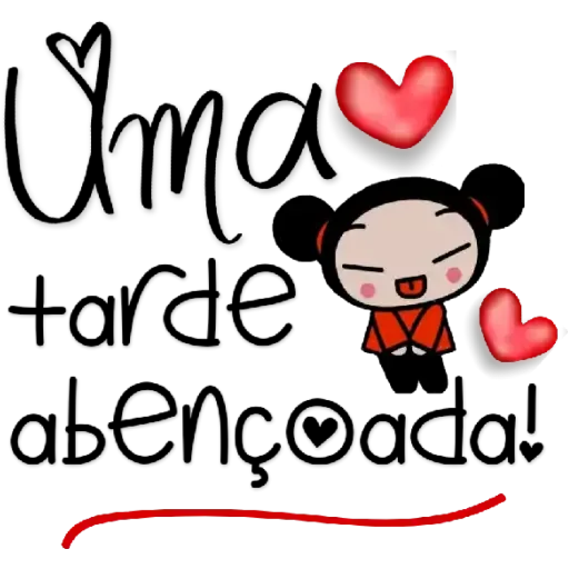 Uma menina fofa com dois coque e um kimono laranja, rodeada de corações vermelhos, com o texto 'Uma tarde abençoada!'