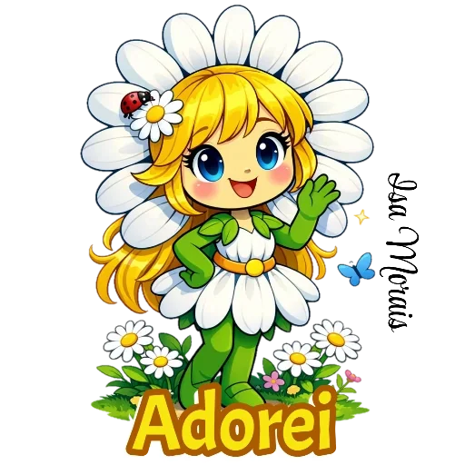 Uma menina de cabelos loiros com uma flor na cabeça e um vestido de flor, com o texto 'Adorei' embaixo. Ela tem um sorriso no rosto e uma joaninha na flor.