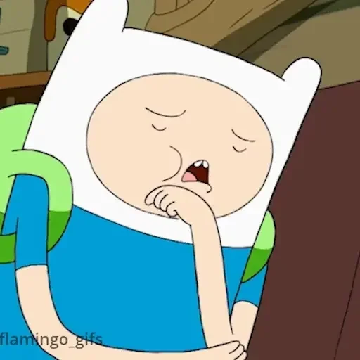 Personagem de desenho animado com cabeça branca e orelhas de gato, vestindo uma camisa azul, com expressão de sono ou tédio, e a mão no rosto.