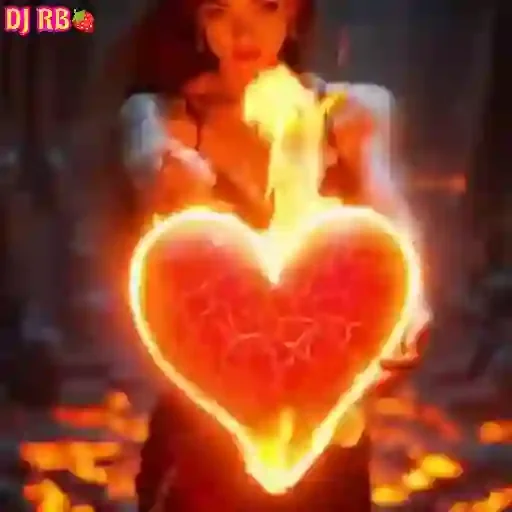 Uma mulher com cabelos escuros e um vestido branco está com uma mão levantada, da qual emerge uma chama em forma de coração. O coração é vermelho e laranja, com chamas ao redor. No canto superior esquerdo, aparece 'DJ RB' em letras rosa.