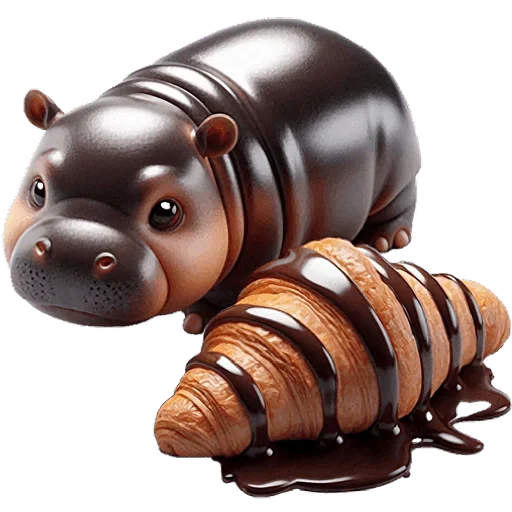 Um hipopótamo com chocolate derretido na pele está ao lado de um croissant também coberto de chocolate.