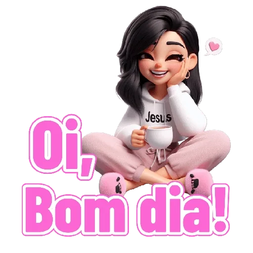 Uma menina de cabelo preto sentada com uma mão no rosto e um sorriso, vestindo uma blusa com 'Jesus' e calça rosa. Ao lado, está escrito 'Oi, Bom dia!' em rosa.