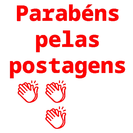 Um texto vermelho que diz 'Parabéns pelas postagens' com três mãos aplaudindo abaixo.