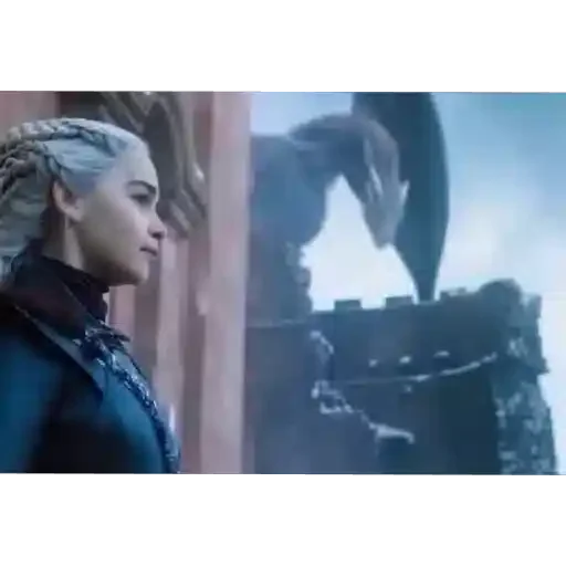 Cena de uma série de TV com uma mulher loira vestida de azul olhando para a direita, ao fundo uma mão segurando uma espada e uma paisagem com céu nublado.