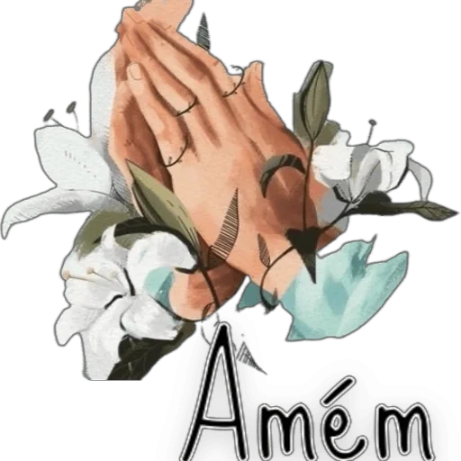 Mãos amarelas com palmas para cima e estrelas ao redor, com a palavra 'Amém' em letras grandes e coloridas.