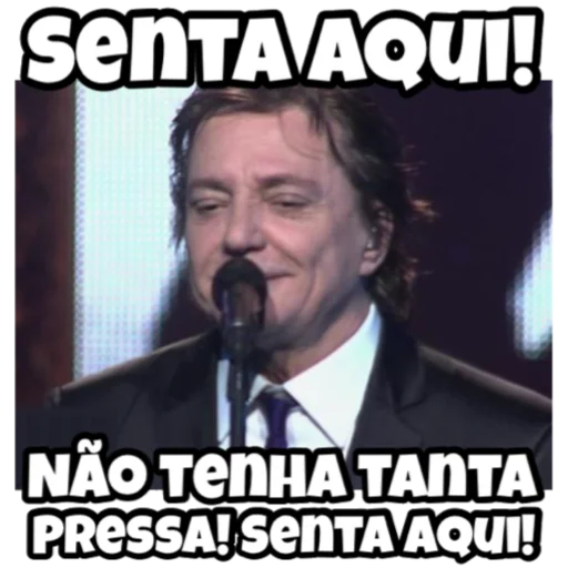 Um homem de meia-idade, com cabelo castanho e um terno preto, branco e roxo, falando em um microfone. Ele tem uma expressão séria. O texto "SENTA AQUI! NÃO TENHA TANTA PRESSA! SENTA AQUI!" aparece em letras brancas com contorno preto.