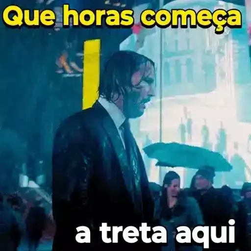 Homem de terno olhando para o lado, com texto 'Que horas começa a treta aqui' em amarelo e branco sobreposto. Fundo azulado com pessoas e guarda-chuva.