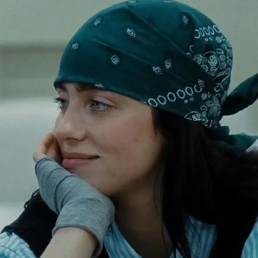 Mulher com bandana verde e luva cinza, apoiando o queixo na mão, com expressão pensativa.