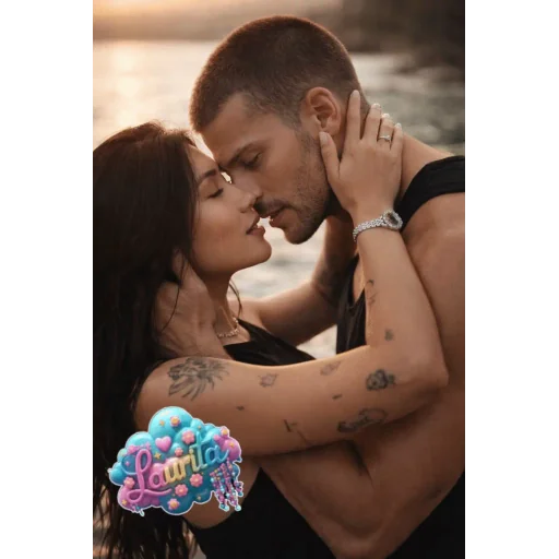 Um casal se beijando ao pôr do sol, com o homem sem camisa e a mulher com um ombro descoberto, ambos com expressões felizes. Há um coração colorido no canto inferior esquerdo.