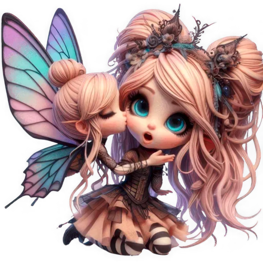 Uma fada com asas coloridas e cabelos rosa dando um beijo na bochecha de outra fada com expressão surpresa. A fada que beija tem o cabelo preso em um coque e asas de borboleta rosa e azul.