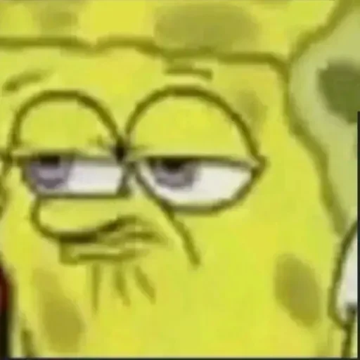 Rosto de esponja amarela com expressão de desconfiança ou surpresa, olhos arregalados e sobrancelhas levantadas.