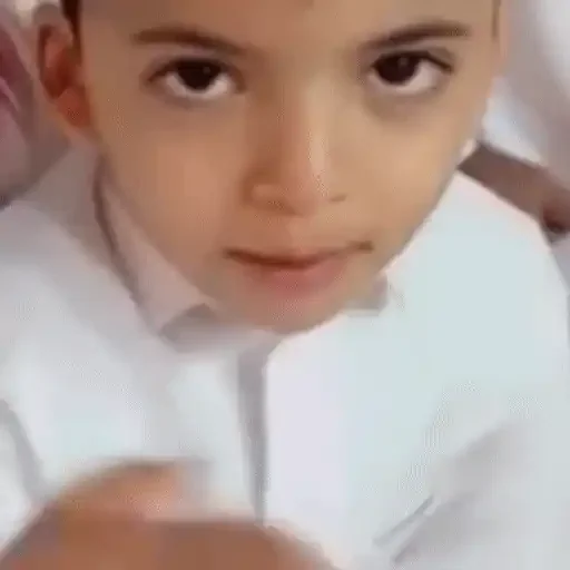 Menino com expressão curiosa, vestindo uma camisa branca, olhando para algo fora da imagem.