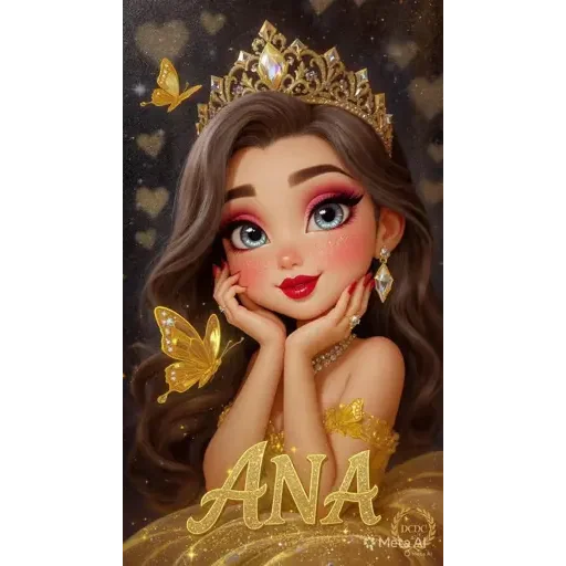Uma princesa de olhos azuis e cabelos castanhos usando uma coroa dourada, com borboletas douradas e corações ao fundo. Seu nome, 'ANA', está escrito em letras douradas na frente.