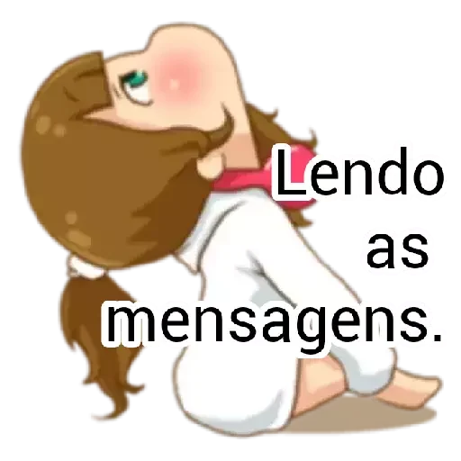 Menina de cabelos castanhos e olhos verdes, com um rosa no pescoço, ajoelhada e lendo mensagens.