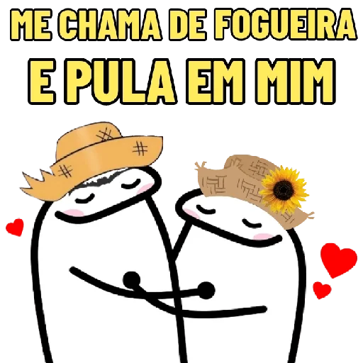 Dois personagens de desenho animado com chapéus, um com chapéu de palha e o outro com um chapéu decorado com um girassol, sorrindo e com corações vermelhos ao redor. O texto 'ME CHAMA DE FOGUEIRA E PULA EM MIM' está escrito em letras amarelas.