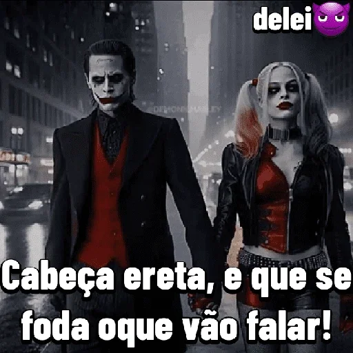 Cena noturna de cidade com o casal de personagens Joker e Harley Quinn, vestidos com trajes característicos. A frase 'Cabeça ereta, e que se foda o que vão falar!' aparece na parte inferior.