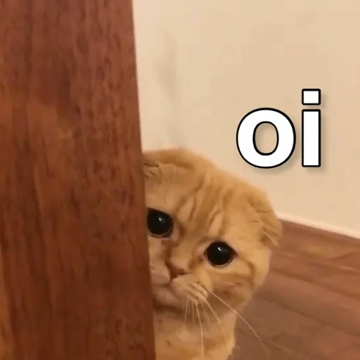 Um gato laranja espiando de trás de uma porta de madeira, com o texto 'oi' ao lado.