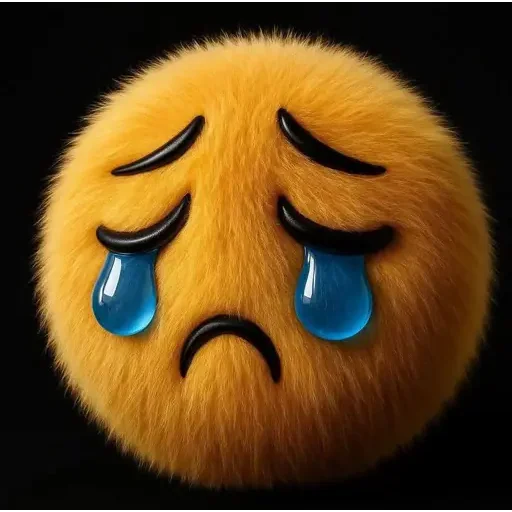 Um emoji de rosto de pelúcia amarelo com expressão de tristeza, olhos fechados e lágrimas azuis.