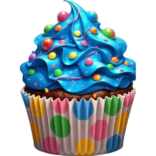 Um cupcake com cobertura azul e confeitos coloridos em cima, em um papel de embrulhar com polka dots.