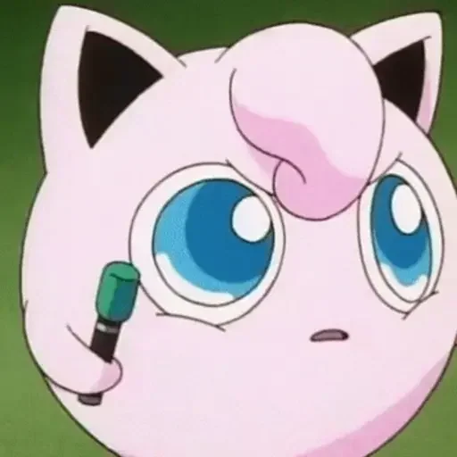Jigglypuff com expressão confusa ou surpresa, olhos arregalados e corados, com cabelo amarelo e orelhas pontiagudas…