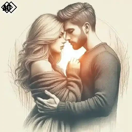 Um casal se beijando, com o homem de camisa cinza e a mulher de cabelo loiro longo e vestido. Eles estão com os rostos próximos.