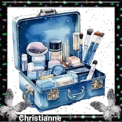 Uma mala azul aberta cheia de produtos de maquiagem e pincéis, com o nome 'Christianne' na parte inferior. A mala tem um fundo branco com um efeito de glitter.