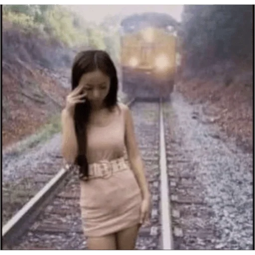 Uma jovem mulher de vestido rosa claro está em frente aos trilhos de trem, com a mão na testa e um trem se aproximando ao fundo.