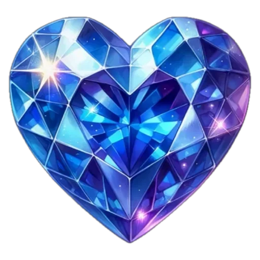 Um coração de diamante azul e roxo brilhante com reflexos de luz.