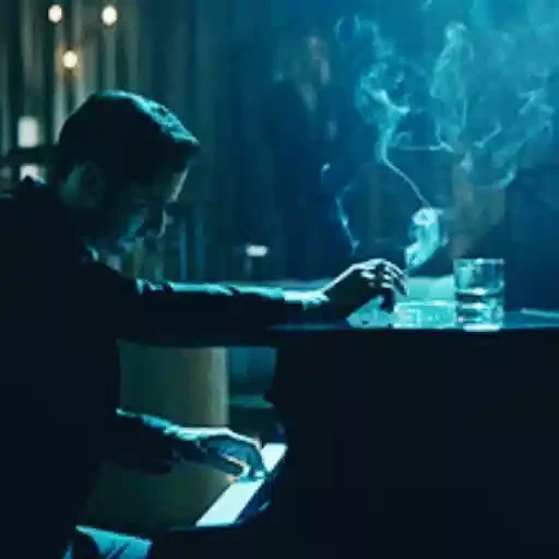 Um homem sentado em um bar, tocando piano, com um copo de bebida ao lado. O ambiente é escuro e iluminado por luzes azuis.