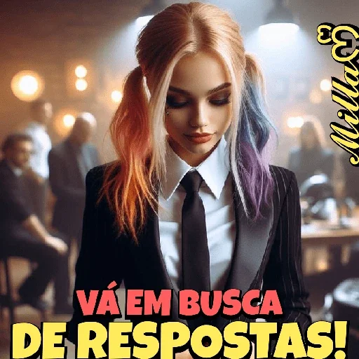 Uma mulher com cabelo colorido em tons de laranja, branco e roxo, vestida com um blazer preto, camisa branca e gravata preta. Ela está em um ambiente com luzes ao fundo e o texto 'VÁ EM BUSCA DE RESPOSTAS!' em destaque.