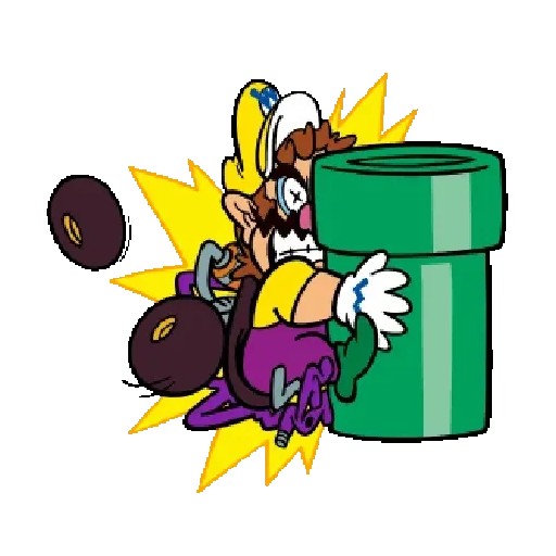 Wario, personagem de videogame, colidindo com um cano verde enquanto moedas marrons voam ao redor, com explosão amarela ao fundo.