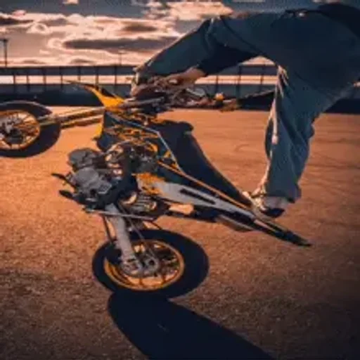 Um homem está prestes a empurrar uma motocicleta amarela e preta em um estacionamento ao pôr do sol.