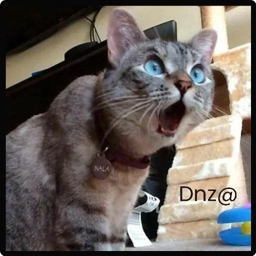 Gato cinza com olhos azuis claros e boca aberta, parecendo surpreso ou assustado. O gato usa um colar vermelho e está em frente a uma escada de madeira.
