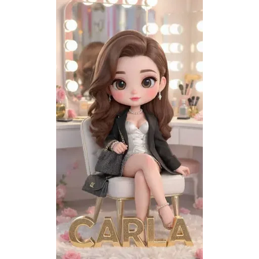 Uma menina de cabelos castanhos sentada em frente a um espelho com luzes, vestindo um casaco preto e saia. A palavra…