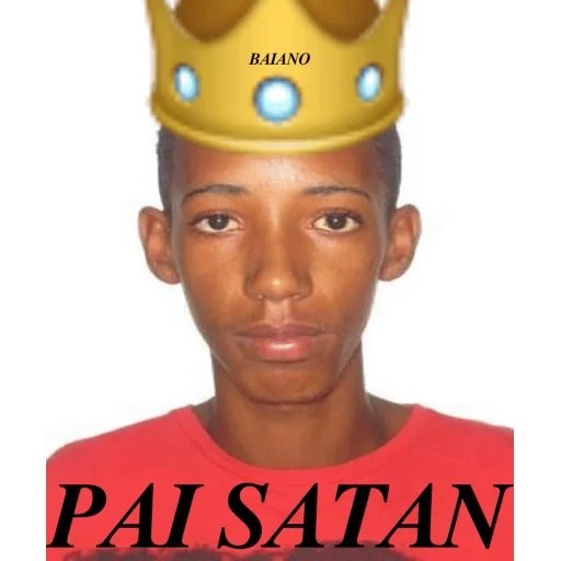 Um jovem com uma coroa dourada na cabeça e uma expressão séria, com o texto 'PAI SATAN' em preto na parte inferior.