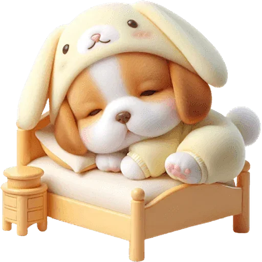 Um cachorro fofinho deitado na cama, vestindo uma roupa de coelho. O cachorro tem manchas marrons e brancas e parece dormir tranquilamente.